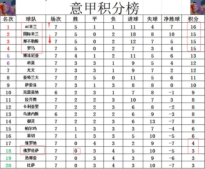 积分榜方面,AC米兰今天逆转绝杀赢球后,超过国米,那不勒斯和罗马1分,时隔2年多再次登顶意甲榜首。国米,那不勒斯,罗马净胜球优劣势分列2到4位。惨遭逆转的佛罗伦萨,新赛季依然是一胜难求,只拿到3分的他们还是陷在降级区。尤文输给科莫后,近4轮3平1负连续不胜,他们排名持续下跌到,现在已经跌到第7。