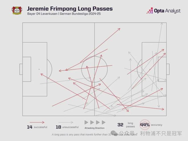 弗林蓬在2024-25赛季德甲联赛中尝试的长传次数显著减少,仅有32次,而他的勒沃库森队友中有11人尝试次数更多。你可能会认为这与他的位置有关,但弗林蓬在2021-22赛季主要担任边后卫时,也只尝试了77次长传;本质上,他只是不像阿诺德那样喜欢通过传球来展开进攻。